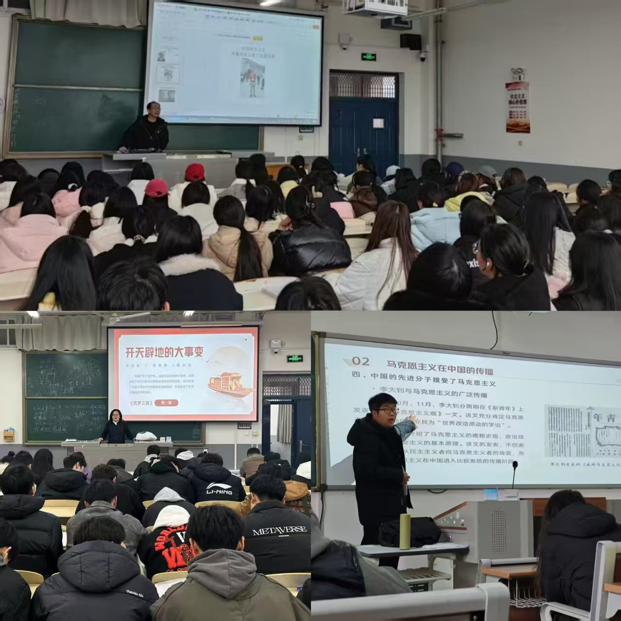 四史教育教学团队以时政热点为导入,以“开天辟地的大事变”为主题,以史为例,讲述近代中国社会的演变、马克思主义在中国的传播、中国共产党早期组织的建立、党的一大和党的二大,引导学生在学习“四史”中,汲取精神力量,升华理想信念,增强发展信心,矢志拼搏奋斗。