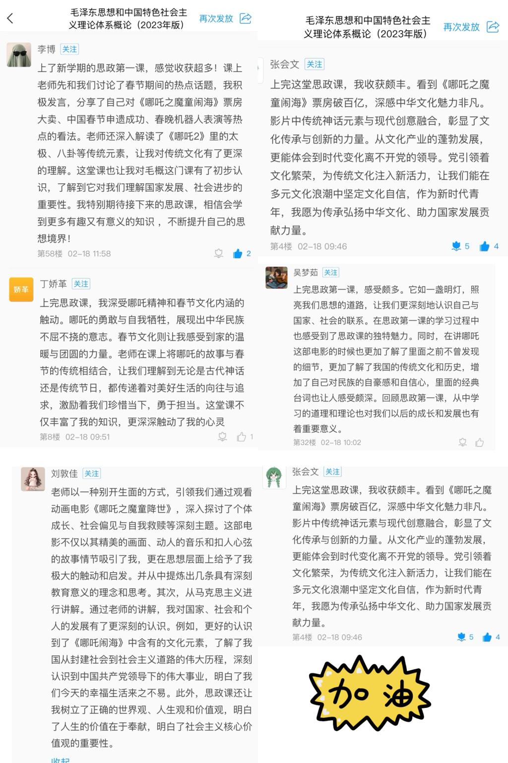 思政热点融入讲。在以教材为“纲”的基础上,聚焦时代主题,围绕世界之变、时代之变、历史之变,融入总书记新年贺词、蛇年春晚带火“非遗版春节”、以深度求索、宇树科技等人工智能企业为代表的“杭州六小龙”引发海内外关注、电影《哪吒之魔童闹海》不断冲击全球票房新纪录、中国登月服命名为“望宇”,黄旭华院士展现出来的科学家精神等时政热点,将具有时代质感的理论源源不断提供给学生,保持思政课教学内容的“深度”与“鲜度”。