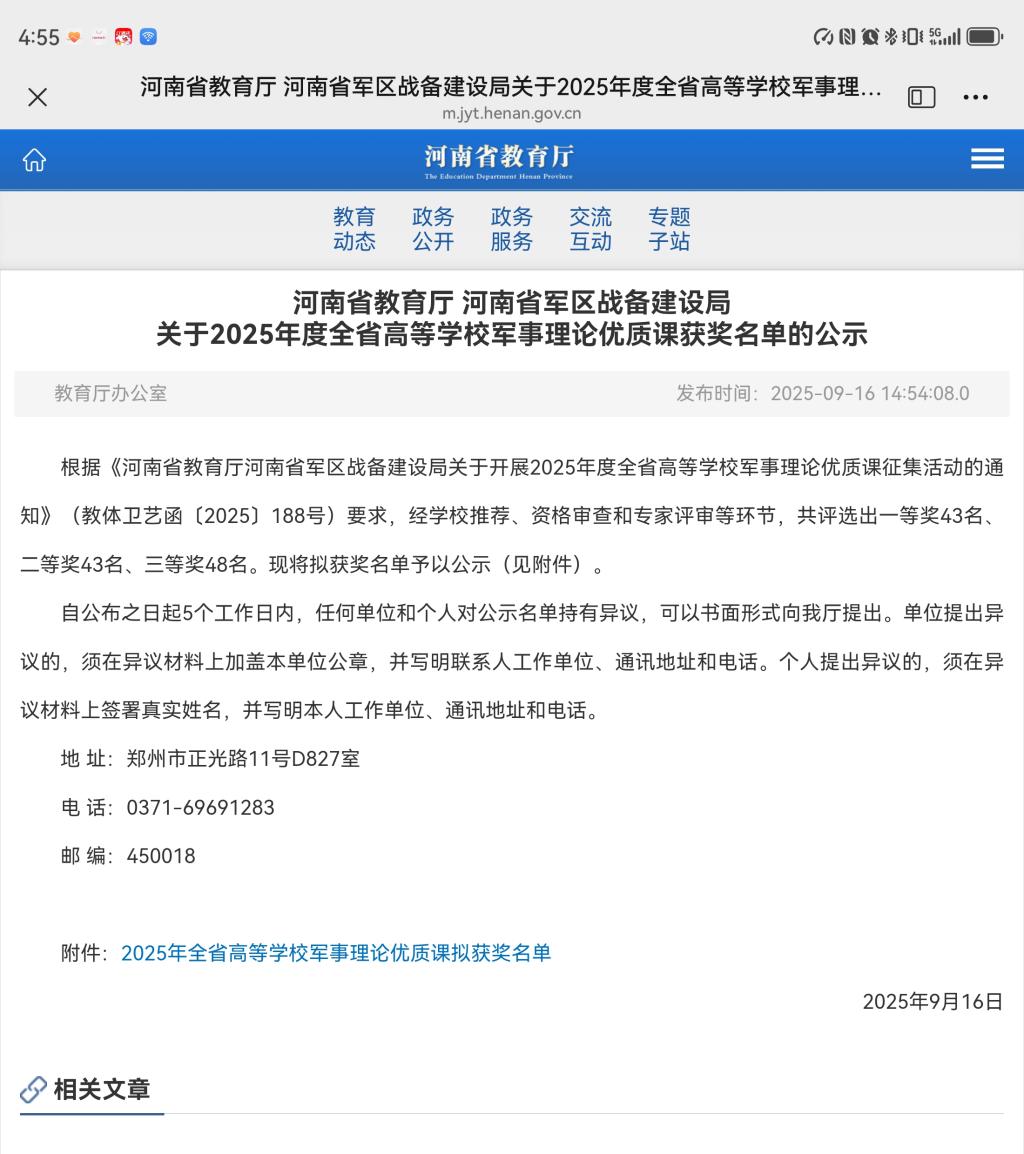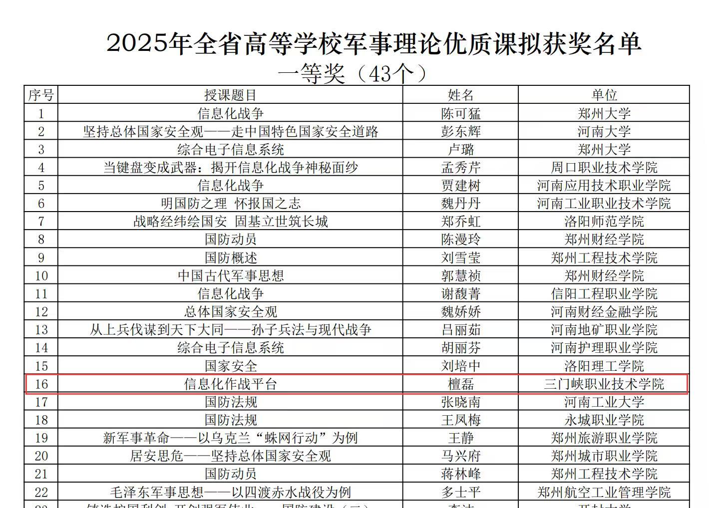 近日,从河南省教育厅传来喜讯,在刚刚结束的2025年全省高等院校军事理论优质课评选活动中,beat365官网beat365正版唯一官网必一国防教育教研室檀磊老师主讲的《信息化作战平台》表现优异,荣获省级“军事理论优质课”一等奖。这一奖项是省内高校军事理论教学领域的最高荣誉。
