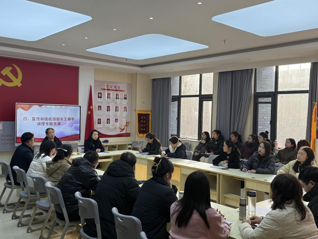 党委委员、宣传和统战部部长王静宇以《深学细悟全会精神,扎实推进“三进”工作——党的二十届四中全会精神解读》为题讲授专题党课,聚焦为党育人、为国育才的初心使命,以清晰的逻辑架构、精准的政策解读和通俗的语言表达,围绕“十五五”时期的历史方位与发展总体要求、“十五五”的战略任务和重大举措以及“十五五”推动经济社会发展的根本保证等方面,深入解读了党的二十届四中全会精神的理论精髓与实践要求,深刻阐释了全会精神与思政课立德树人根本任务的内在逻辑,深度把握了“三进”工作在筑牢青年理想信念根基中的关键作用。强调将全会精神作为思政教育的“根”与“魂”,深入推动全会精神与教材体系精准对接、与课堂教学创新融合、与学生思想实际深度契合,以“躬耕教坛”的自觉把理论优势转化为育人优势,切实培养出担当民族复兴大任的时代新人。
